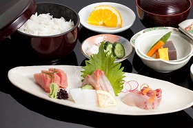 Assorted sashimi, boiled vegetables with soy broth, miso soup and dessert. |